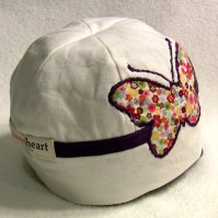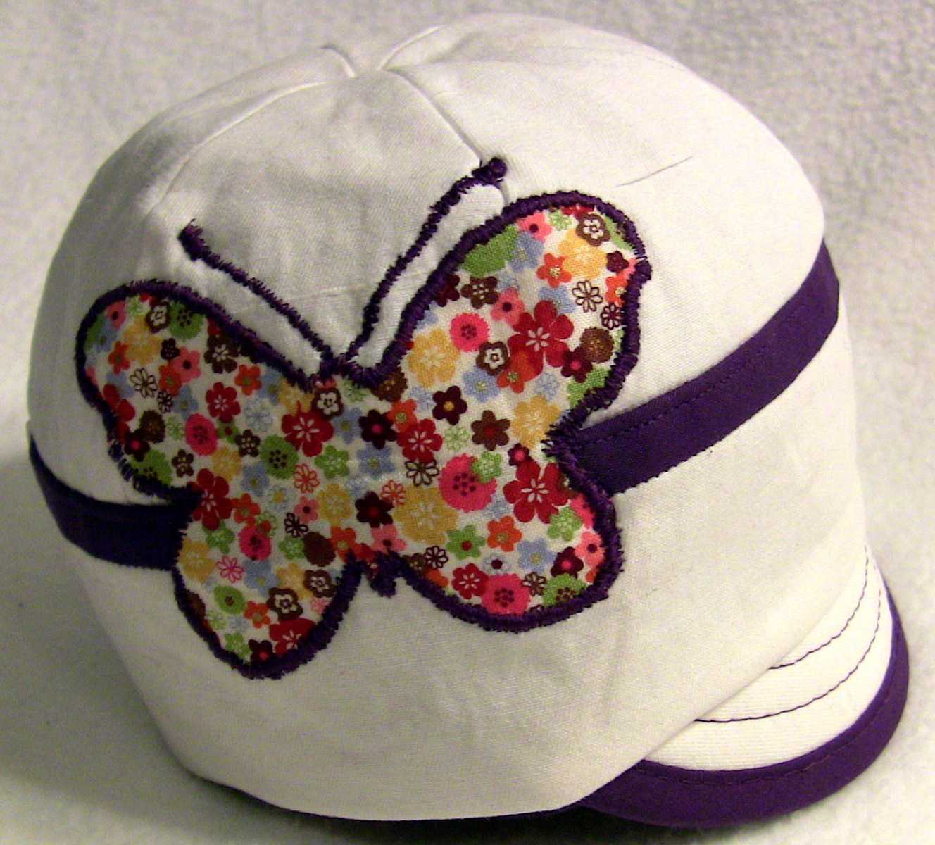 Appliqued hats are adorable and so cute on little girls!!! Featuring a multi-colored butterfly, this hat shouts FUN. Made of all new materials, this hat is made up of white cotton twill, 100% cotton lining, and a soft cotton jersey band. Deep plum bias binding completes the look for a finished touch.