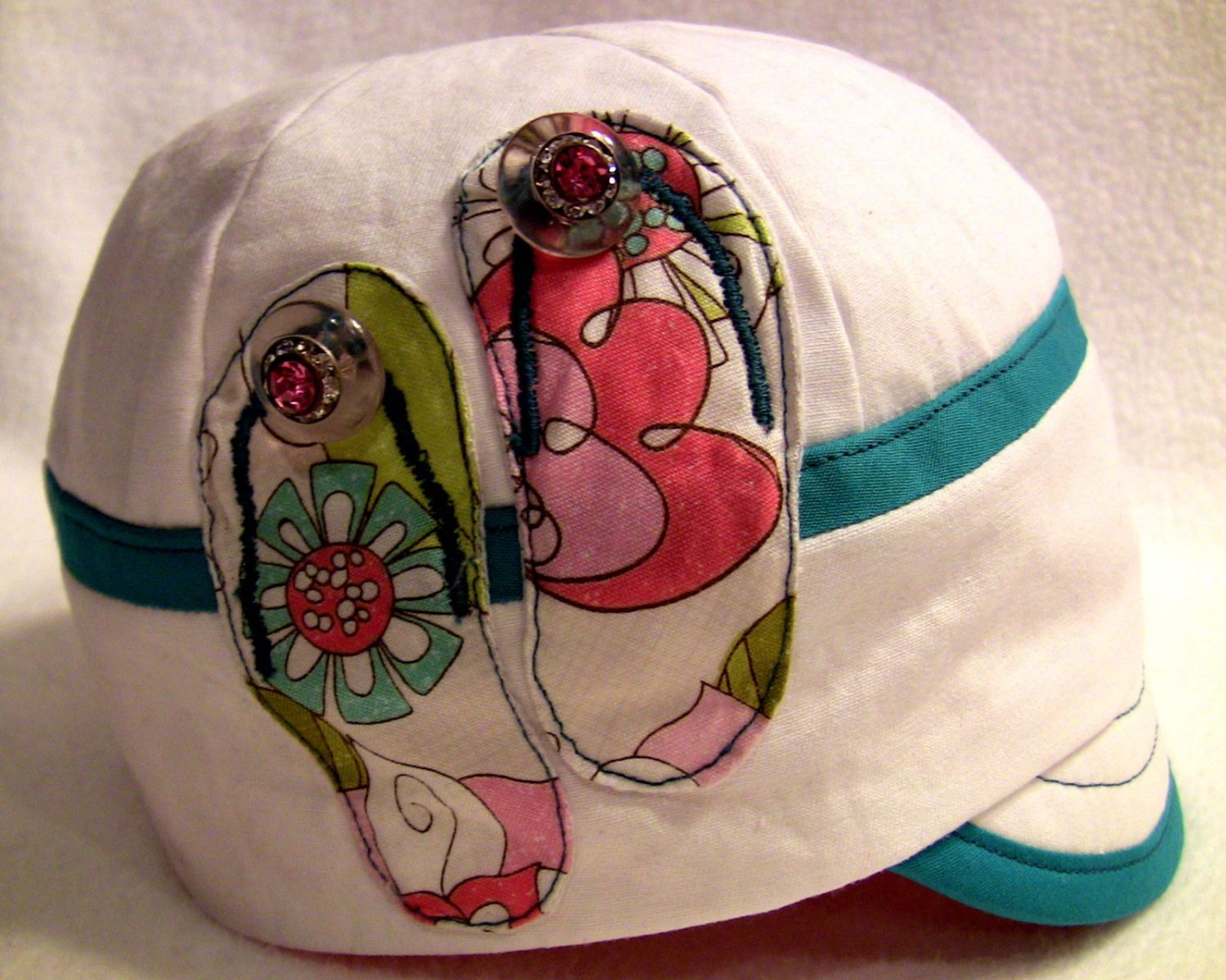 Every girl LOVES shoes. Right? 🙂 Nicole’s Flip-Flop Sweetheart (Newsboy) hat features a pair of charming summer flip-flops. White twill fabric paired with teal blue bias binding makes for a fun splash of color. Vintage buttons are Nicole’s Great-Grandma’s which makes this hat extra special! Worn with a favorite pair of jean or a lazy pair of sweats this hat is sure to be a blast. And of course, hidden inside is a very important message that every little girl needs to hear – that she is worth far more than rubies. Handmade by Sweetheart by Janna