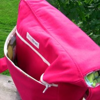 The inside pocket is also very cute. This bag has a hanging pocket which has slots for pens, a few larger items, and a zippered compartment for objects like Nook’s or other e-readers. The outside of the bag has two compartments for water bottles or other easily accessible items. However, as a busy Mom, a few bigger pockets and zippered pockets attached to the inside lining would be much more useful. My mind is already whirling as to how I can figure that one out. 🙂 I love this matching Sweetheart Hat. Raspberry twill fabric coordinated with a delicious Amy Butler print. Yum! I’ve decided to keep both the bag and the hat for myself. They match. How cool is that!