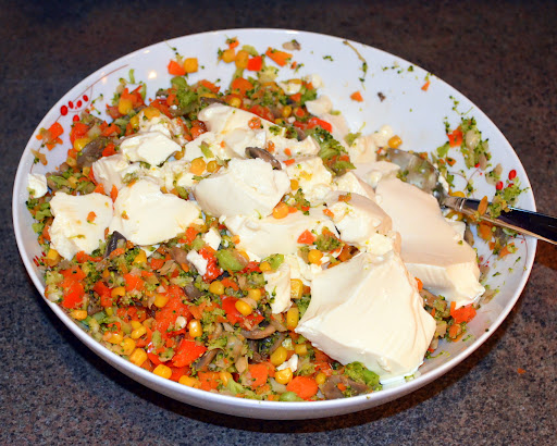 Removing the broccoli and carrots from my non-stick pan, I added both to my bowl of onion, garlic, and mushrooms and mixed all together. Back into the pan, I added chopped red peppers and a can or organic corn which I had thoroughly rinsed. These I also cooked until they were softened. I added both to my vegetable bowl and again mixed.