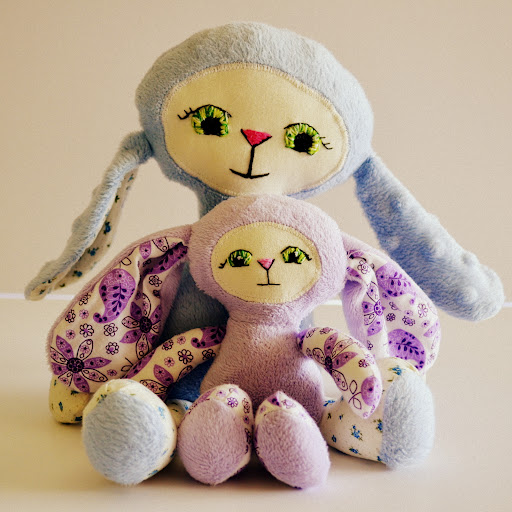 Bunnies are stinkin cute! After working many hours to perfect a bunny design, I’ve come up with these two cuties. The blue bunny is 12 inches, the purple 6 inches. Perfect for little hands.