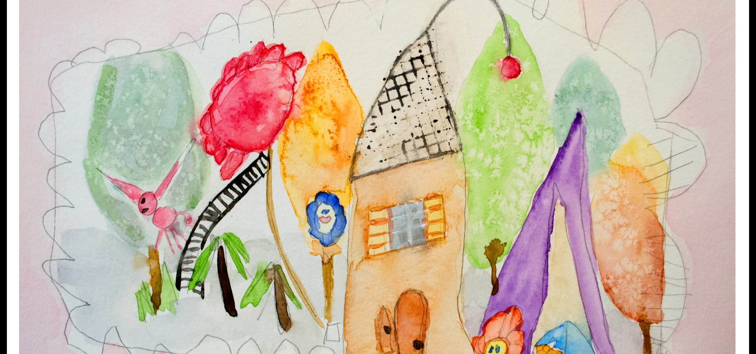 My five-year-old daughter drew this village picture, with a house, pink cotton candy tree (her most favorite snack), garage, car, dog, and flowers. We added a few trees to fill in the blank areas. Around it all is a fence. She would have preferred that I watercolor paint the entire picture pink, but I assured her that added color would look nice too.