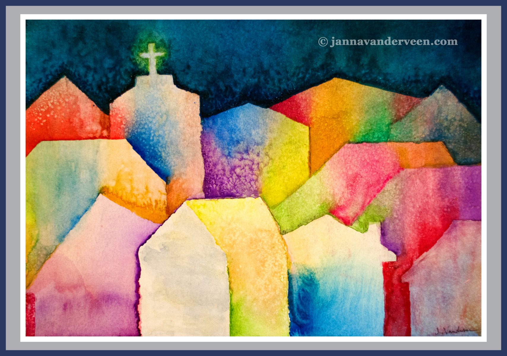 My watercolor painting was inspired by Sydney Harper’s, “Rooftops.”
