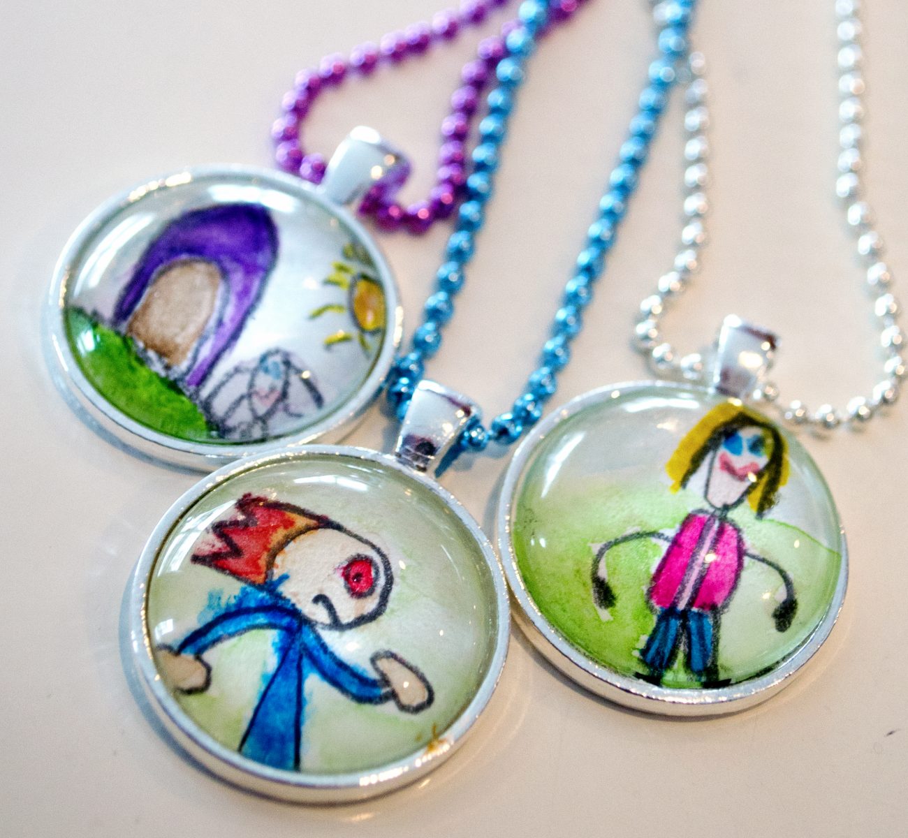 I suggested that my kids draw a picture which I’d watercolor. Of all the necklaces they created, these were my favorites!