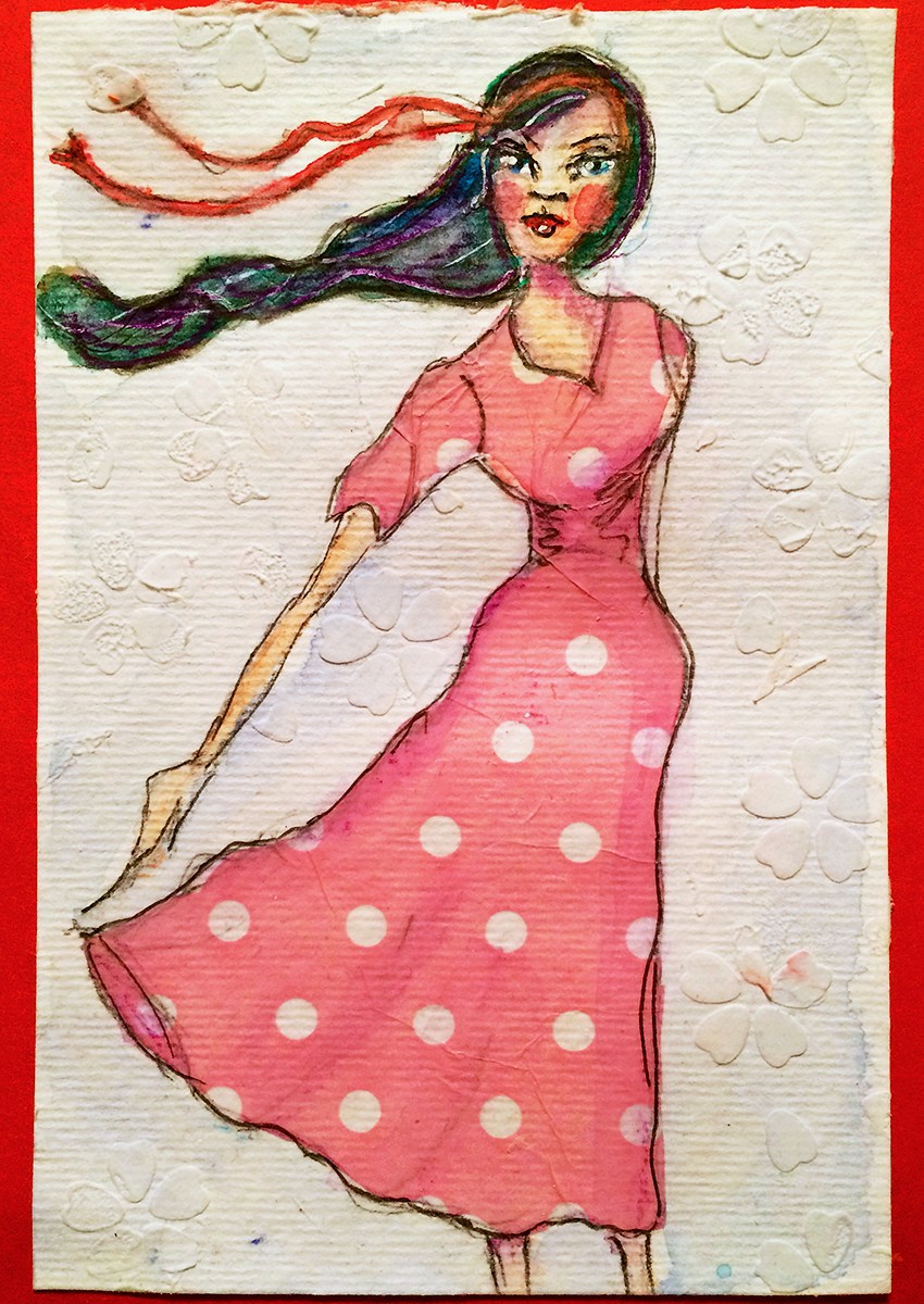 For Christmas this year, I received a lovely tutorial by Jane Davenport from my wonderful in-laws, on figure drawing. After watching several of her classes, I’ve determined that it will probably take some time to master the human shape. However, it looks like a fun process. Here is my first watercolor and mixed media painting (thank you card) from Jane Davenport’s I Heart Drawing class.