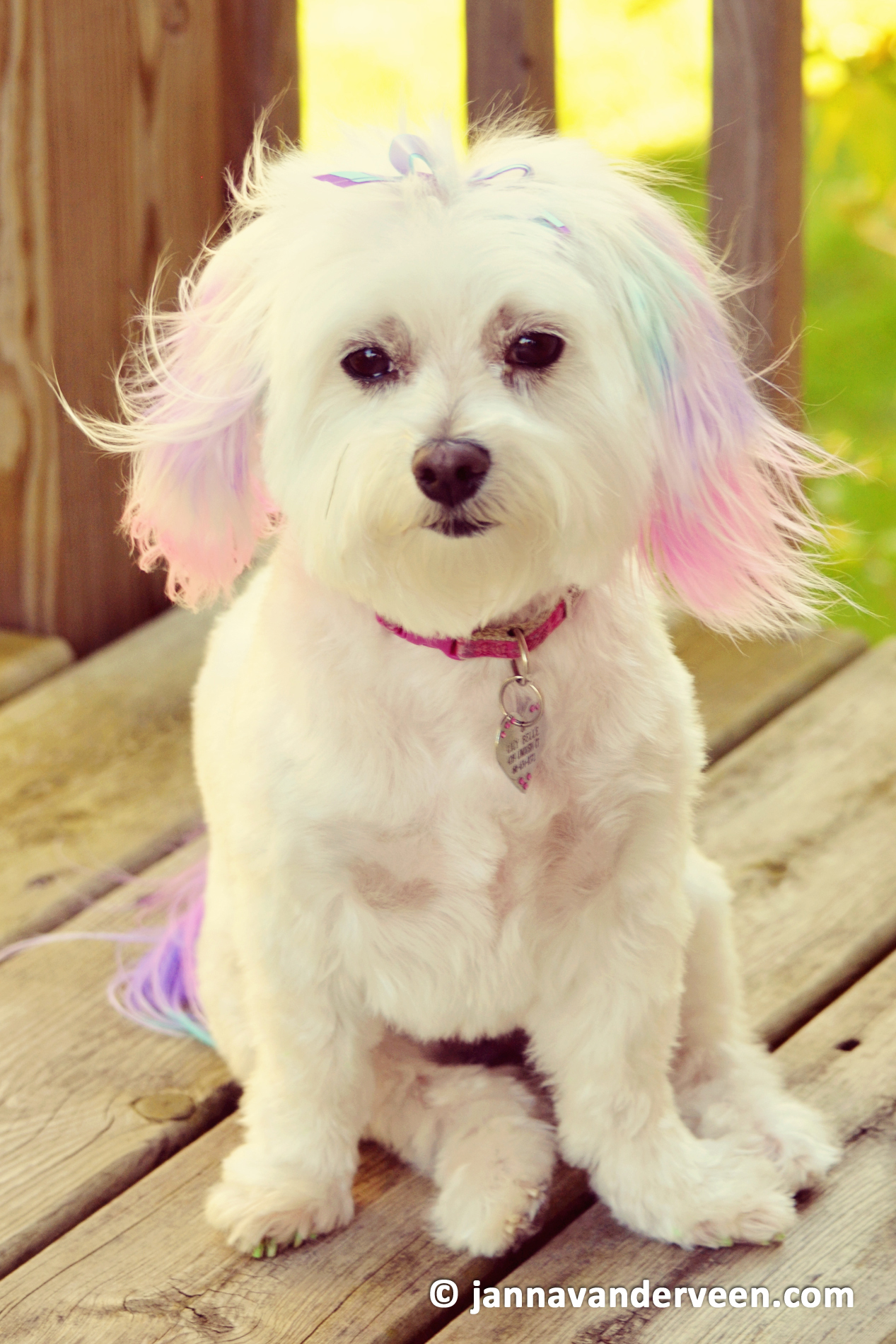 I giggle. Seriously. This poochini brings me tremendous joy and laughter. When my daughter and I picked her up from the groomers yesterday and discovered her ombre ears/tail and green painted toenails, you can only imagine our wide smiles and peels of laughter.