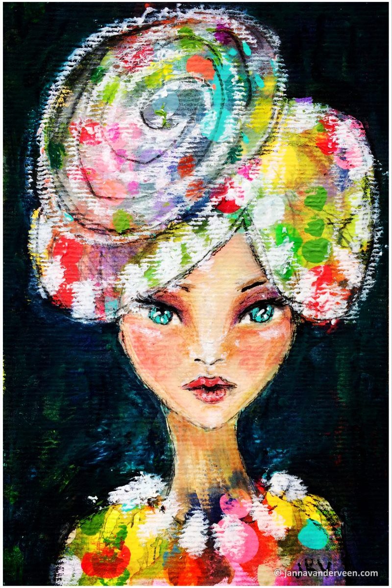 Vivid, colorful, and full of light, this young woman surfaced on my page as I coaxed her to life with my fingers and brushes. I painted her on a 4″ by 6″ piece of watercolor paper (140 lb.) using acrylics, oils pastels, and inks.