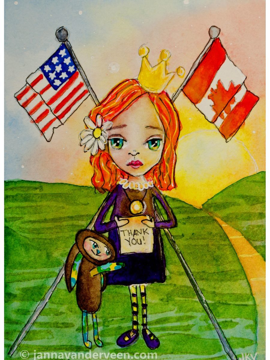 This is the second, in a series of three watercolor thank-you cards, featuring my whimsical princess with her bunny. I love painting sunsets and valleys reflecting the beauty of life all around. I used a combination of artist grade MaimeriBlu and professional grade Winsor Newton watercolor paints on this 5×7 card.