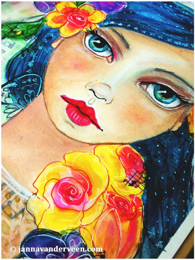 One of my favorite on-line art teachers is Tamara Laporte from willowing.org in South England. An accomplished artist and soon to be author, she has mastered the craft of creating whimsical characters on paper. She recently completed a series of paintings using only a few Tombow markers and some Caran d’ache neocolor crayons. I was intrigued by the simplicity of her supplies and the complexity of her pieces, and thought that I’d try to emulate her work. I had to improvise on my supplies, since I do not own Tombow markers (they are on my bucket list of art supplies to someday own), and used a variety of watercolor paints, inks, and pencils instead. Overall, I think my whimsical girl turned out pretty nice.
