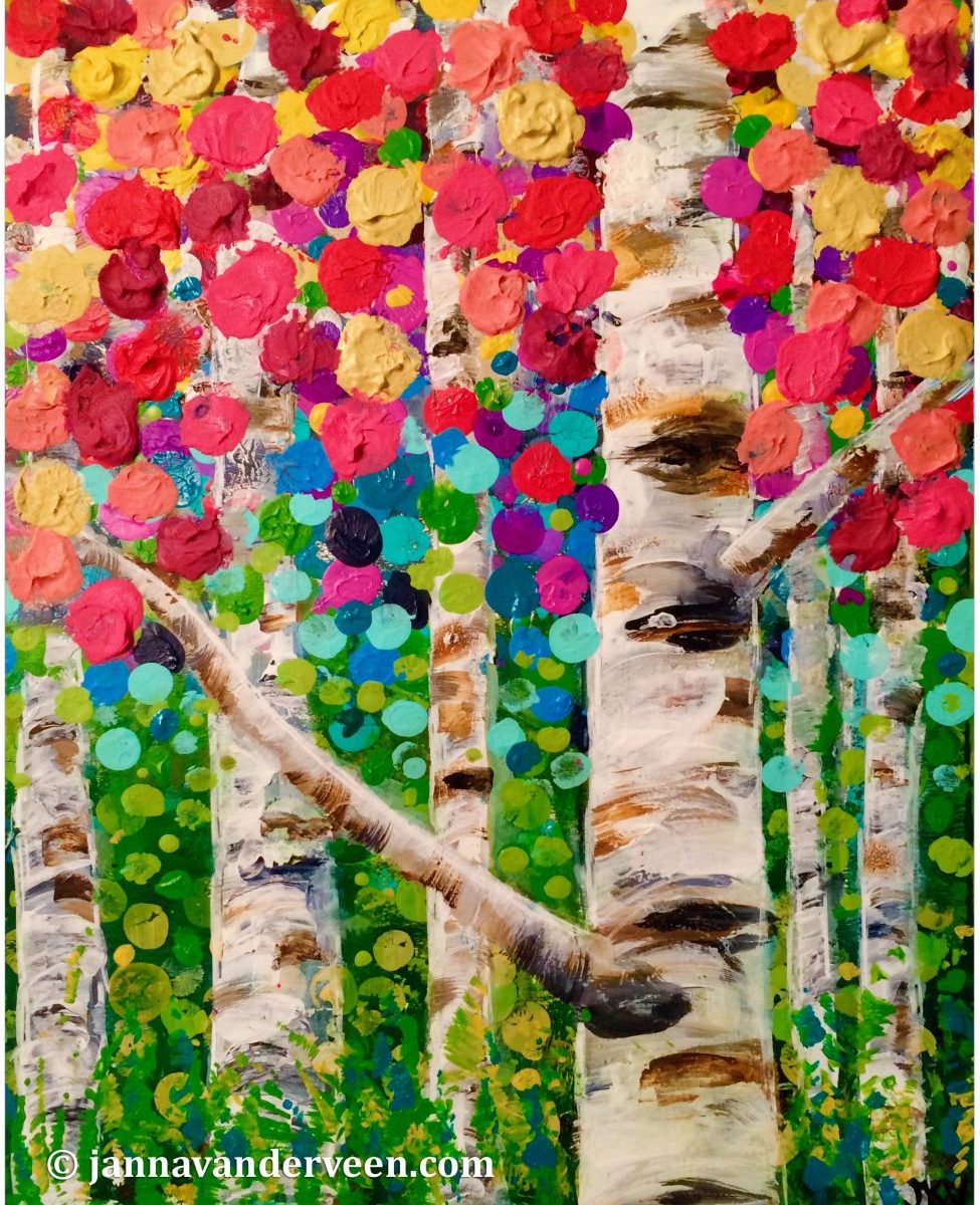 I recently stumbled across Canadian painter, Melissa Mckinnon’s artwork. I have long-loved incorporating finger-painting into my artwork, as evidenced by my previous paintings, and felt inspired to try and paint my own birch/aspen tree. I completed this painting on an 8 x 10″ piece of 140 lb. watercolor paper and used a variety of acrylic paints as well as modeling paste for texture.