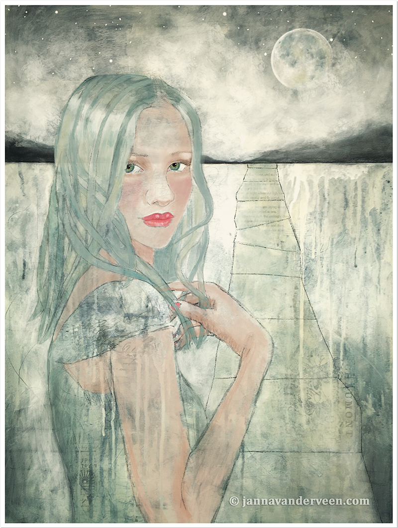 In this mixed media painting, I first used charcoal, inks, ephemera, Inktense pencils, acrylics, and then Procreate. #GirlatDusk #IvyNewport #AcrylicPainting #CreateWonder