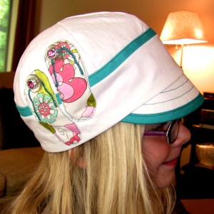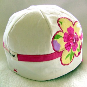 I love these little newsboy hats for children. They are so whimsical! This flower hat was designed for my almost two-year old niece, Kate. Made out of white twill fabric this hat features a large appliqued flower that features loads of pink, white, green and purple. It is destined to snuggle a cute little noggin.
