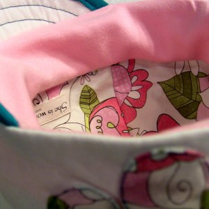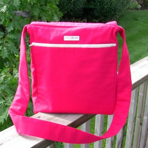 The inside pocket is also very cute. This bag has a hanging pocket which has slots for pens, a few larger items, and a zippered compartment for objects like Nook’s or other e-readers. The outside of the bag has two compartments for water bottles or other easily accessible items. However, as a busy Mom, a few bigger pockets and zippered pockets attached to the inside lining would be much more useful.  My mind is already whirling as to how I can figure that one out. 🙂