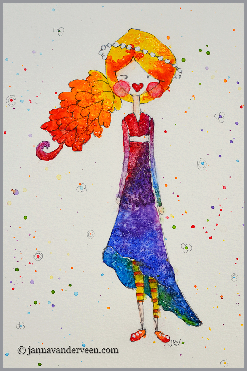 Vivid, colorful, and full of light, this young woman surfaced on my page as I coaxed her to life with my fingers and brushes. I painted her on a 4″ by 6″ piece of watercolor paper (140 lb.) using acrylics, oils pastels, and inks.